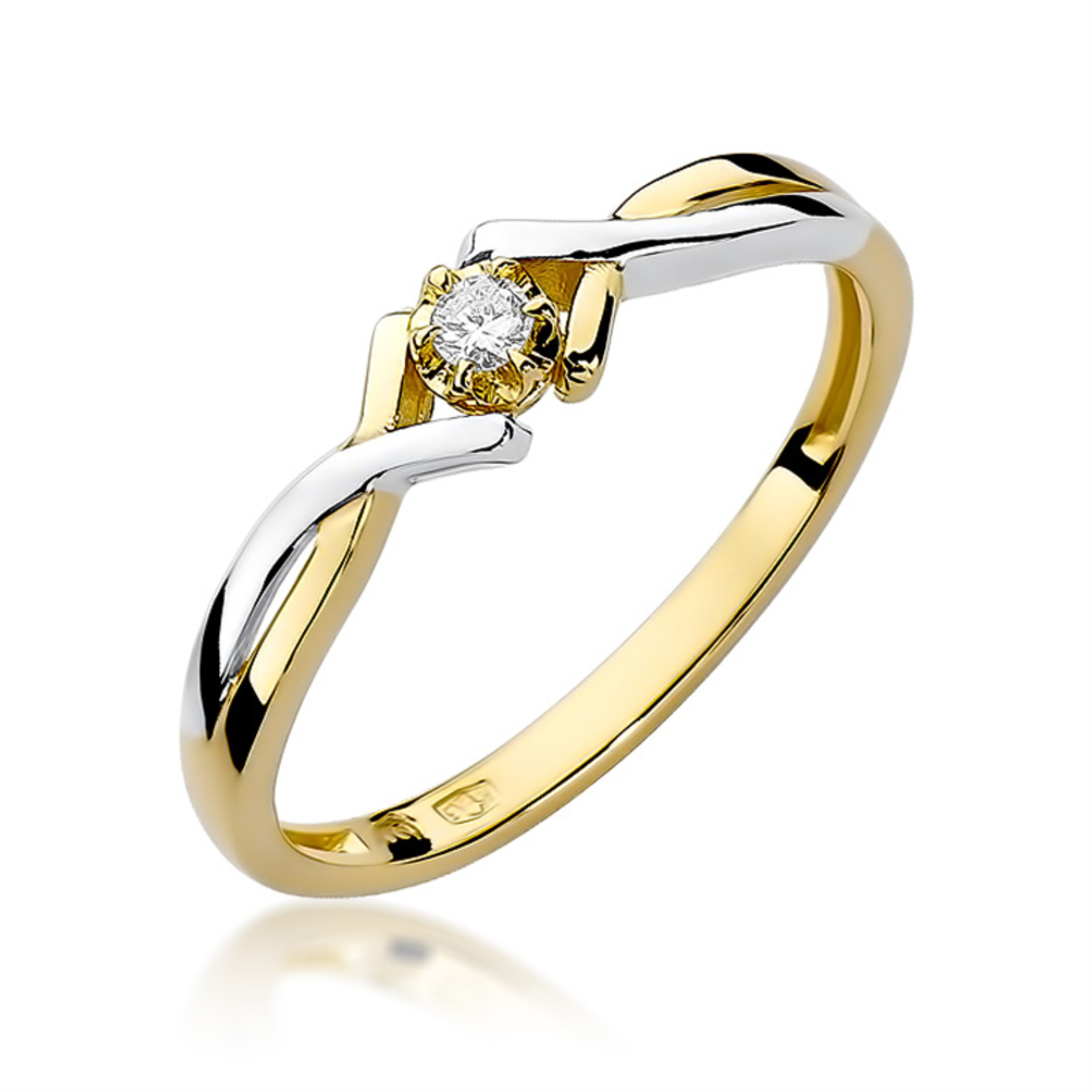 Pierścionek zaręczynowy z centralnie umieszczonym brylantem o masie 0.04ct, czystości i kolorze SI/H o doskonałym szlifie brylantowym. Wykonany z 14-karatowego żółtego i białego złota próby 585. Prezentowany pierścionek posiada certyfikat potwierdzający autentyczność diamentów oraz próby złota.
