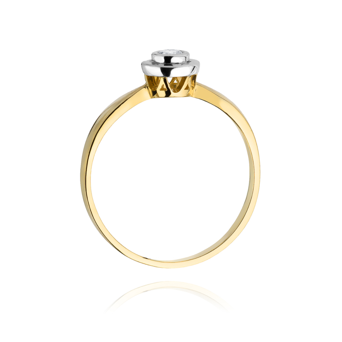 Pierścionek zaręczynowy z centralnie umieszczonym brylantem o masie 0.10ct, czystości i kolorze SI/H o doskonałym szlifie brylantowym. Wykonany z 14-karatowego żółtego i białego złota próby 585. Prezentowany pierścionek posiada certyfikat potwierdzający autentyczność diamentów oraz próby złota.