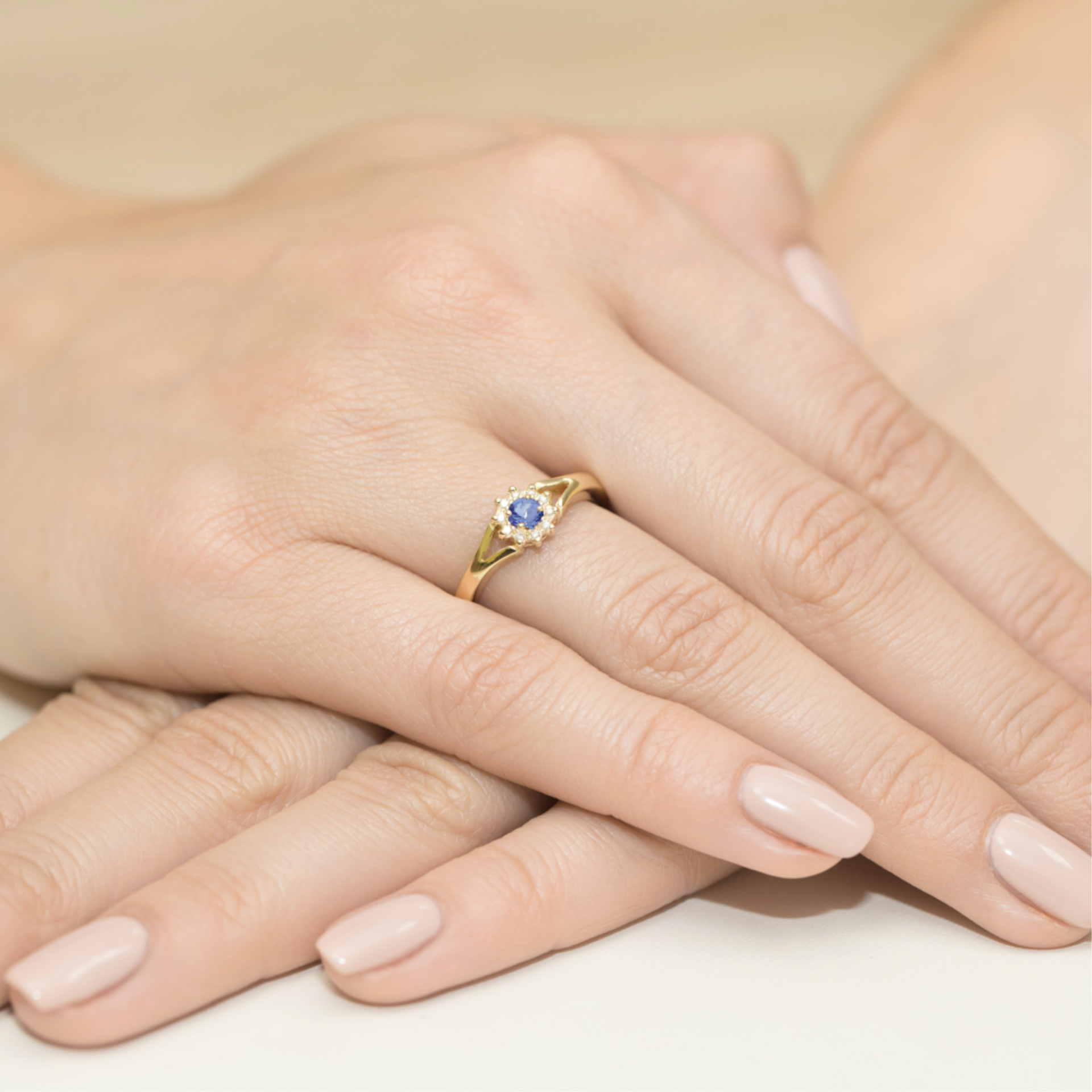 Pierścionek zaręczynowy z centralnie umieszczonym tanzanitem o masie 0.15ct i doskonałym szlifie brylantowym. Oprawę pierścionka tworzą boczne diamenty o łącznej masie 0.09ct, czystość i kolorze SI/H oraz szlifie brylantowym. Wykonany z 14-karatowego żółtego złota próby 0.585. Prezentowany pierścionek posiada certyfikat potwierdzający autentyczność kamieni naturalnych, diamentów oraz próby złota.